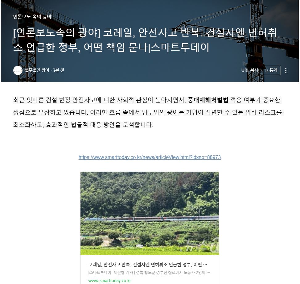 [언론보도속의 광야] 코레일, 안전사고 반복..건설사엔 면허취소 언급한 정부..|스마트투데이 > 언론보도 속의 광야